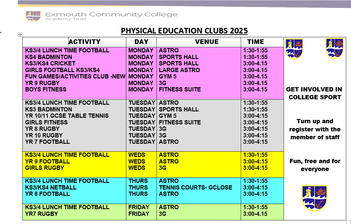 Music Department Year 11 Support - every Thursday after school in room 254 and also welcome to work on Coursework any break, lunchtime or after school. Please click on the link Exmouth Community College - Music Clubs and Tuition (exmouthcollege.devon.sch.uk)