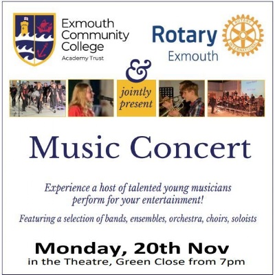 ECC and Rotary Exmouth are holding music concert on 20th November from 7pm in the Theatre on Green Close, informaton on ticket purchases can be found in the poster below.