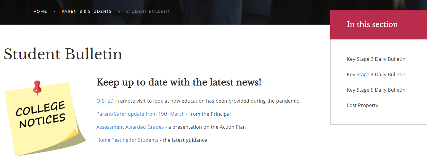 We know that as a large College there is a huge amount of information that is being given to you as parents and carers and to students also. We want to make communications as accessible and streamlined as possible for all staff, students, parents and carers. We have therefore created a Student Bulletin page on our website.