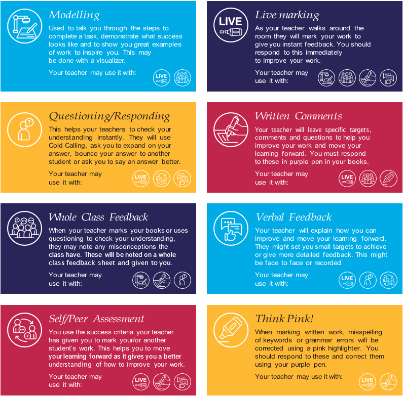 Assessment is the ongoing process teachers use to gather information about what students know, and to identify any learning gaps. Students are assessed in many different ways. This will include teacher questioning, exercises to retrieve prior knowledge, quizzes, marking of books and more formal assessments. Faculties will plan what type of assessment is appropriate at specific times. Assessments will always be linked to the curriculum plans that have been published and the Knowledge Organisers that students use for homework.
