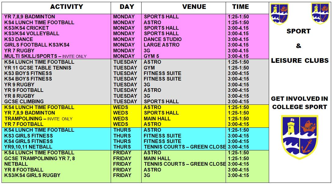• After school Clubs: Students need to wear PE kit (if you don't have PE lesson that day, bring your kit in your bag and change after school)